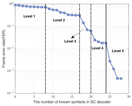 As an example, Figure 3 shows the FER performance over the Gilbert–Elliott (GE) channels versus the number of known symbols in a polar codeword, where we take the polar code information bits rate to be , and , and, thus, . Each dashed line represents a bound of a UEP level, and the solid line marks the start of the last level with no extra RS protection. Using the notations in Figure 1, we have , and the last UEP level starts from the 25-th RS codeword.