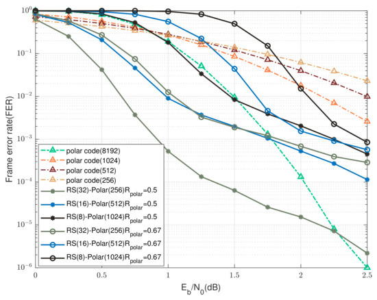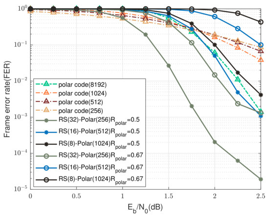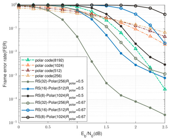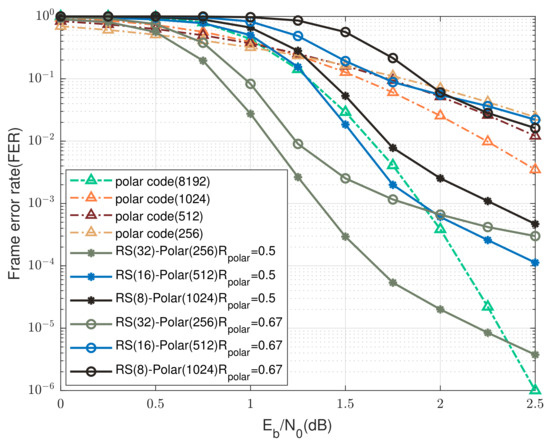 - Jiang, X.; Wu, S.; Liu, X.; Jiao, J.; Zhang, Q. Multi-RS Concatenated Polar Codes with Enhanced Interleaving and List Decoding. In Proceedings of the 2018 IEEE 88th Vehicular Technology Conference (VTC-Fall), Chicago, IL, USA, 27–30 August 2018; pp. 1–5. [Google Scholar]