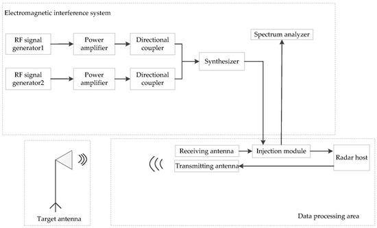 The working frequency band of the equipment under test (EUT) is f0 ± 100 MHz (f0 is the center frequency). Under the existing conditions in the laboratory, the electromagnetic irradiation is difficult to meet the demand of the third-order intermodulation generating for the test equipment, so the out-of-band IMFA-3 test is conducted on the test equipment by using the method of the equivalent substitution of the electromagnetic radiation by the differential mode injection [18]. Secondly, in order to eliminate the influence of the intermodulation component produced by the nonlinearity of the microwave power amplifier on the receiver, two interference systems were used in the experiment. The flow chart of the test system is shown in Figure 1. The main specific parameters of the equipment are as follows: the signal generator uses Ceyear1435 F, which can generate a 9 kHz~40 GHz microwave signal. The power amplifier uses AR 200 T, the working frequency band is 7.5~18 GHz, and the maximum output power is 200 W. The directional coupler is matched with the power amplifier, and the coupling degree of the forward power monitoring port is 50 dB. The spectrum analyzer uses Ceyear company’s 4204 G. The target uses a horn antenna. Combined with GJB8848-2016 [22], the output signal of the signal generator is amplified by the power amplifier and is synthesized by the combiner, and the interference signal is injected directly into the receiver’s RF front-end by the injection module. The spectrum meter monitors the final injection of the interference power into the RF front end.