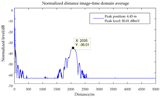 The IMFA-3 signal target imaging is analyzed according to Equation (13). The first exponential term contains the first power of k, which can be regarded as a frequency-domain signal with time point 1 and a linearly varying frequency, and this term will produce a false alarm target with a fixed position by the IFFT transform processing. The third exponential term in Equation (13) contains the square of the variable k, which will make the interference signal energy disperse, resulting in the IMFA-3 target waveform to broaden and the energy to disperse. The second exponential term contains the delay time td term, which has different effects on the position of the false alarm target. In the next analysis, the position of the IMFA-3 signal, that is, make , where m = Round[N(fltr + Δf*td − 2f1tr + f2tr)], the inverse Fourier transform is performed on the linear term in Equation (13):