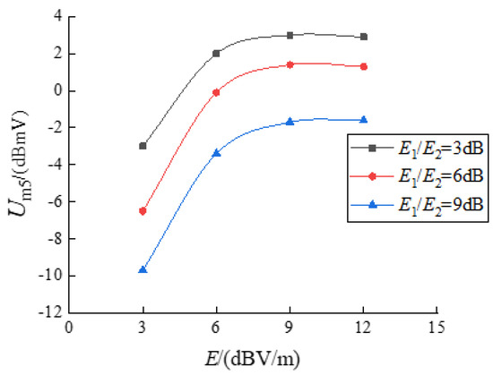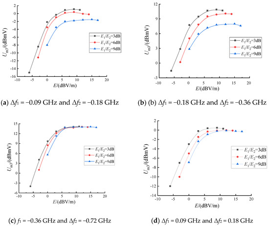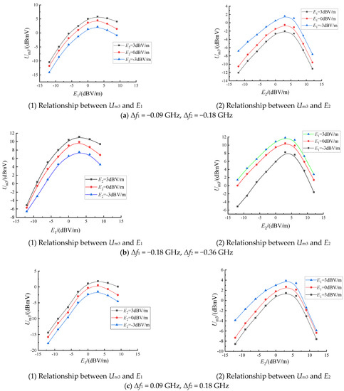 (3) The IMFA-3 frequency is certain, the interference field strength component E1 or E2 changes from −15 dBV/m to 0 dBV/m, and the combination of the dual-frequency interference frequency offset is different, and the range of the Um3 is different, indicating that the filter has different suppression effects on the different frequency offset interferences.