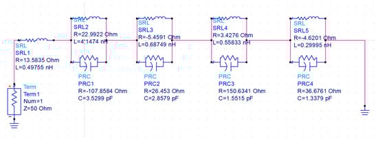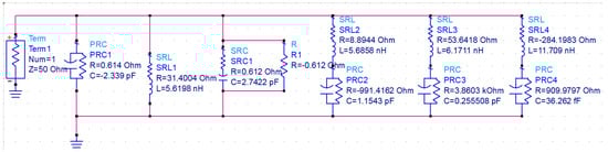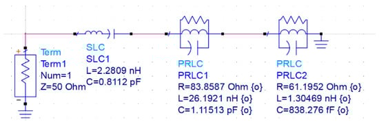 Figure 1b displays the results of CST simulations of the reflection coefficient (S11), while Figure 1c represents the real and imaginary sections of the input impedance curves of the examined antenna. An antenna’s equivalent circuit model may be derived from these curves, revealing its features at resonance. For example, in Figure 1b, each dip in the S11 curve might be interpreted as a different resonance frequency. The real and imaginary sections of the input impedance curve are about 50 and 0 Ohms, respectively, at these positions. That is to say, the factors considered are in agreement with resonant frequencies. Two such balance modes are found in the studied frequency range. As it turns out, a third-order circuit is presented as the basis for a lumped element model. Using resistors (Ri), inductors (Li), and capacitors (Ci), the suggested circuit model is a series of parallel RLC circuits. The actual component of the input impedance curve is used as a starting point for Ri (Equation (7)). The Formulas (8)–(11) are used to determine the starting values of the Li and Ci components.