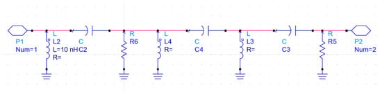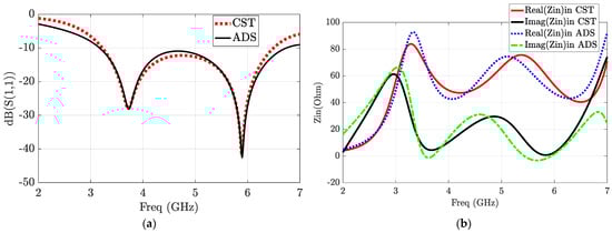 To check the validity of the established model, the ADS software was used. The circuit model frequency responses are compared with CST simulations. The results are depicted in Figure 3a,b. Based on these results, it is seen that both graphs agree well with each other with a slight shifting.