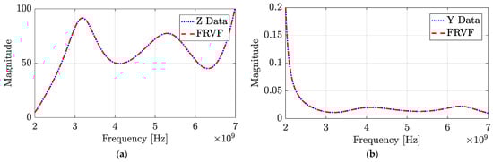 Comparison of the fitted rational vector function (FRVF) and simulated data (data): (a) impedance; (b) admittance.
