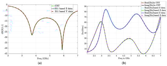(a) Comparison of the SPICE equivalent circuit based on impedance and CST S11 results; (b) comparison of the resulting impedance from CST and equivalent circuit.
