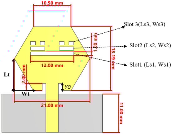 The antenna geometry is a combination of a hexagonal patch and Cantor fractal slots of the second iteration. It is observed in Figure 8 that the hexagonal patch can be described as a corner truncated conventional rectangular patch. The equivalent circuit of the conventional patch is formed of resistance (Rp), inductance (Lp), and capacitance (Cp), as described in Figure 8. Those lumped elements are calculated using the following Equations (14)–(17) [].