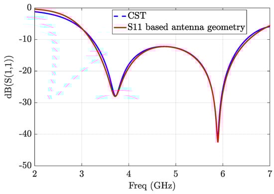 In the antenna circuit model described in Figure 9, Lf and Cf represent the feed inductance and the antenna static capacitance, respectively. The impedance of the hexagonal patch is modelled by Zp. The Cantor multifractal slots are represented by L-C resonator cells marked Zs, whereas Cc represents the mutual coupling among the radiating patch and the ground plane. The partial ground plane is modelled by L-C resonator as Zdgs. For further understanding, the antenna wideband impedance discontinuities (as described in Figure 1) are introduced in the equivalent circuit and represented by parallel RLC resonators. Using iterative techniques and curve fitting, the tuned values of circuit-lumped elements and the overall antenna equivalent model is shown in Figure 9b. The comparison of S11 response between CST simulation and the equivalent circuit simulation is shown in Figure 10. Based on these results, it can be observed that the computed equivalent circuit model almost perfectly matches the CST results.