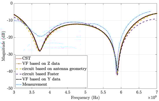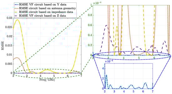 To show the accuracy of the generated circuit models, the RMS error for between the antenna results and the results using the computed circuits are plotted in Figure 11. As clearly seen, the generated circuits using a vector-fitting approach allow a satisfactory approximation of the antenna behavior, and the RMS error on the magnitude is 1 × 10−6 within the operating bandwidth, whilst the circuits synthesized using the Foster approximation based on the antenna impedance data and based on antenna geometry show good accuracy. Consequently, the equivalent circuit model of the suggested design using the vector-fitting approach will be considered in the next study.