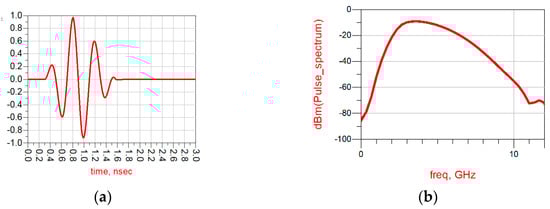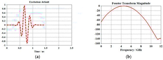 The antenna used is of the ultra-wideband (UWB) kind, and it is true that a high performance in the frequency domain does not guarantee that the antenna will behave well in the time domain. Since this is the case, the seventh Gaussian derivative pulse (Figure 14a) is employed as the antenna excitation signal in CST to provide a desirable time-domain characteristic. Figure 14b shows the power spectral density (PSD) of a Gaussian pulse.