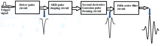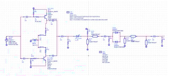 The seventh Gaussian derivative pulse generation circuit shown in Figure 15, includes four parts: drive pulse production, SRD [] pulse sharpening, second derivative pulse forming, and fifth-order derivative RLC. The driver circuit inverts the trigger signal to a driver pulse with high amplitude and sharp edges at its output terminal. Accordingly, the SRD pulse-shaping circuit based on SRD and Schottky diode generate a Gaussian pulse from the driver pulse by combining the negative reflected pulse toward the delay line with the other positive pulse in the terminal load. Then, a second Gaussian derivative pulse circuit forming is employed beside a backward decoupling circuit. This circuit is used to reduce the backward coupling effect and the resulting pulse’s ringing level. Figure 16 describes the considered circuit.