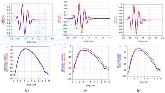 The input pulse is compared with the antenna output pulses. The output pulse waveforms are obtained by placing various loads in the terminal of the antenna equivalent circuit. From Figure 19a, it is found that the load of the free space (377 Ohms) has little effect on waveform distortion. The antenna presents good pulse-preserving capability and ensures the correspondence of the input and output waveforms signals after scaling and time shifting. While Figure 19b,c demonstrate that loads of 50 Ohms and 75 Ohms reveal more waveform distortions then more data loss.