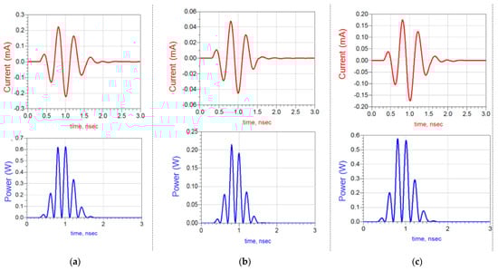 (a) The antenna equivalent circuit’s current and power waveforms connected to a 50 Ohm load; (b) current and power of the antenna equivalent circuit connected to a 377 Ohm load; (c) current and power of the antenna equivalent circuit connected to 75 Ohm load.