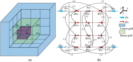For the traditional FDTD method using the pure dense grid, especially for the simulation of EM interacting with plasmas and targets with delicate structures [28,29,30], the grid size must be small enough to capture the motion of electromagnetic fields and plasma dynamics. However, the fine mesh for simulating plasmas will lead to large memory cost and a long execution time. To solve this problem, the subgridding mesh technique is adopted [31,32,33]. Figure 2 shows the 3-D subgridding interface and the x-component electric field interpolation schematic diagram in the x–z plane. For the sake of simplicity, a grid ratio (GR) of the coarse grid and the dense grid is 3:1 is illustrated. represents the electric fields in the coarse grid and indicates the electric fields and in the dense grid. There are three different interpolation types in Figure 2. and belong to type one, in which the coarse grid electric fields overlap with dense grid electric fields, and these electric fields can be directly obtained from coarse grid electric fields. , , and belong to type two, in which these electric fields can be obtained with the linear interpolation method using the coarse grid electric fields. , , , , and belong to type three, in which these electric fields can be obtained with the linear interpolation method using the dense grid electric fields. The coefficients are displayed in Figure 2b.