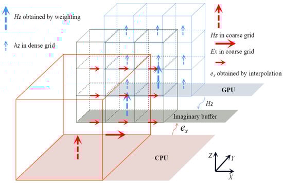 In this paper, there are two types of parallelism, one is the coarse-grained parallelism and the other is the fine-grained parallelism. In a heterogeneous system, the parallelism between CPUs and GPU is coarse-grained parallelism. This type of parallelism is achieved by arranging the coarse grid electric fields and magnetic fields in CPUs and arranging the dense grid electric fields, magnetic fields, electron density, and velocity in GPUs. The parallelism between threads is fine-grained parallelism. As shown in Figure 5, the FDTD grid is decomposed and allocated to the different processor units (PUs) in the heterogeneous system. Consequently, the components on the truncated boundary, as well as those involved in their updated equation, are not involved in the same processor. Data communication between adjacent processors is necessary after each iteration. In this paper, there is an imaginary buffer established between the two processors. After the electric field on the truncated of CPU is updated at each time step, obtained by interpolation method from coarse grid is transferred to the imaginary buffer for updating the magnetic field on the truncated of GPU in the next time. Similarly, after the magnetic on the truncated of GPU is updated at each time step, obtained by weighted summation method from dense grid is transferred to the imaginary buffer for updating the electric field on the truncated of the CPU in the next time.