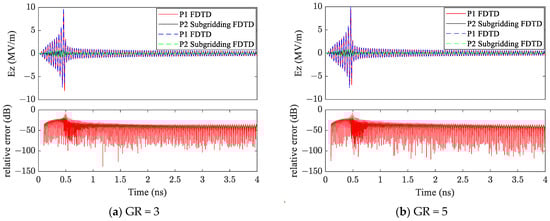 We recorded the component at points P1 (the center of aperture) and P2 (the distance between P1 and P2 is 2.81 mm). Figure 7 shows the temporal waveform of the electric fields recorded at P1 and P2 for GR = 3, 5, 7 and 9. The results are consistent with the results in [13]. From Figure 7, one can see that the electric field at P1 increases initially due to the field confinement of the metallic aperture. While the electric field magnitude rises above the breakdown threshold, the electric field magnitude dramatically decreases. The temporal profile of the electric field at P2 also demonstrates a similar result after the air breakdown; that is, the existence of plasma hinders the field transmission. Moreover, relative errors in dB at P2 are also shown in Figure 7. For different GR, there are maximum relative errors when the air starts ionizing. After 0.5 ns, the relative error is at much lower values.