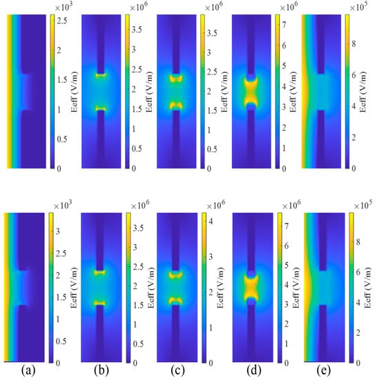 To acquire a deep understanding of the physical process and compare the results between the dense grid and subgrid, the spatial and temporal evolution of the effective field is presented in Figure 8, where (a), (b), (c), (d), and (e) represent the field distributions at 0.01 ns, 0.36 ns, 0.42 ns, 0.45 ns, and 0.1 ns, respectively. At 0.01 ns, due to the edge effect, the electric field at the aperture edge begins to increase, leading to the ionization of air. Within a short period, electron density increases dramatically. Then, the plasma formed by ionization will further cause electric field enhancement around the plasma. This process is shown in Figure 8b,c. In Figure 8d, the center of the aperture reaches the maximum value, the air in the center of the aperture also starts ionizing. After ionization of the entire aperture is completed, the plasma hinders the propagation of electromagnetic waves, as shown in Figure 8e.
