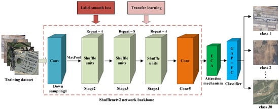 This study explores the design of efficient RSSC models from the perspective of lightweight networks. The overall architecture of the proposed model is shown in Figure 3. The proposed model uses a lightweight ShuffleNet v2 as the backbone and utilizes a transfer learning strategy to initialize the backbone parameters. Then, the efficient channel attention (ECA) [44] is embedded behind the backbone to suppress useless features and achieve weighted processing of features for subsequent classification processing. While maintaining the lightness, the LSR loss function is implemented to consider the multidimensional loss calculation and further improve the noise immunity of the model. To summarize, RSCNet is based on lightweight network that ensures the speed of inference while introducing optimization strategies to improve its accuracy.