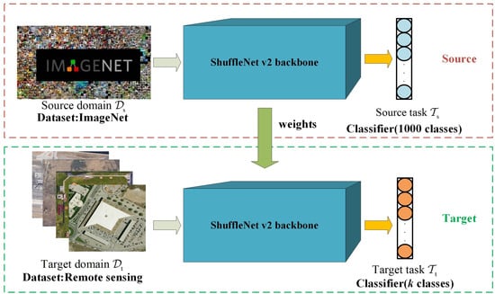 The process of transfer learning works by having the model trained on a larger domain dataset to gain a priori knowledge. This prior knowledge is then used as a basis to continue training in the target domain dataset to improve the training starting point of the model [45]. In the RSSC task, the flow of the transfer learning implementation is shown in Figure 4, i.e., given the source domain and the source task , the corresponding target domain and the target task . In the process, the source and target domains are expected with similarity, and the source domain is generally larger than the target domain. ImageNet [46] is a large definitive image classification dataset with 1000 classes of classification. There are a lot of studies [47,48,49] based on this dataset, which effectively improve the accuracy of the model in the target domain. Therefore, for the RSSC task, the ShuffleNet v2 model with training weights on the ImageNet dataset is used for transfer learning.