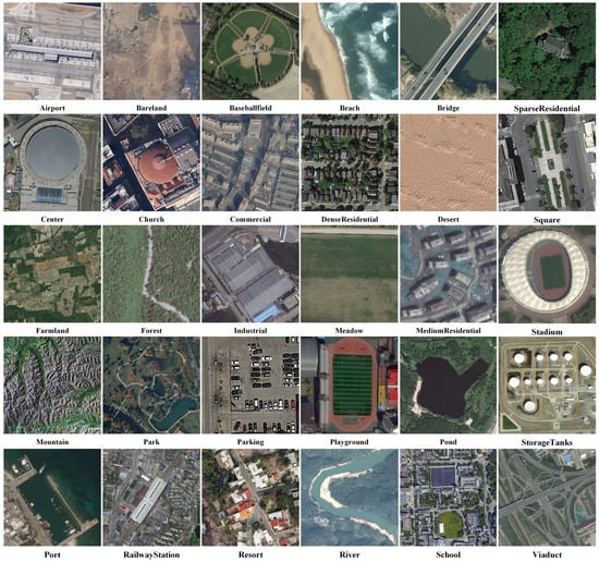 The AID dataset [29], published by Wuhan University in 2016, was a large dataset for RSSC. The AID was mainly collected through Google Earth, with an image resolution of 600 × 600 pixels, containing a total of 30 categories of scenes and a total of 10,000 images, with a varying number of 220–420 images in each category. A partial sample of the AID dataset was shown in Figure 6.