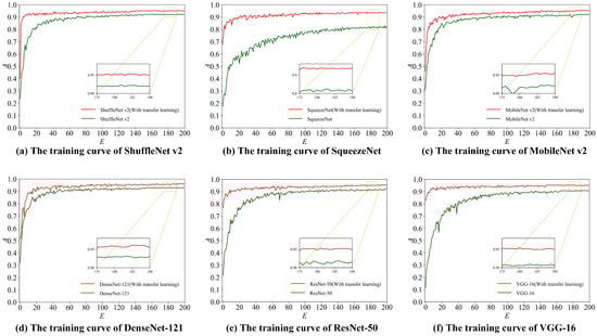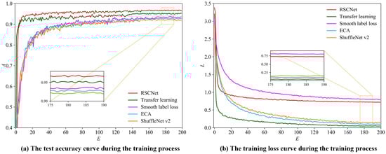 The training curves are shown in Figure 8. Note that the formula for calculating the loss has changed after using the label smoothing loss function. As can be noticed in Equation (10), the LSR loss is not only calculated in the dimension where the true label is located, but also in other dimensions using the hyperparameter . So the final loss value will be higher than using the normal cross-entropy loss function. As can be observed from the curves, each model completes the training in the convergence state. All three improvement strategies improve the classification accuracy of the models, which proves that each improvement point is effective for the model accuracy improvement.