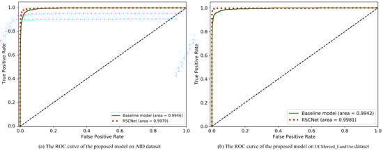 To further illustrate the classification performance of the model, the ROC curves of the proposed model on the two datasets are plotted. As shown in Figure 9, it can be seen that the upper left point on the ROC curve of RSCNet is closer to the (0,1) point compared with the original model on both the AID and UC_MerceLandUse datasets. It indicates that the proposed model is able to obtain good recall and specificity at higher classification confidence threshold in the face of remote sensing image classification. Moreover, the area formed by the ROC curve of RSCNet with the x-axis is higher than that of the original model, which proves that the proposed model has better classification performance.