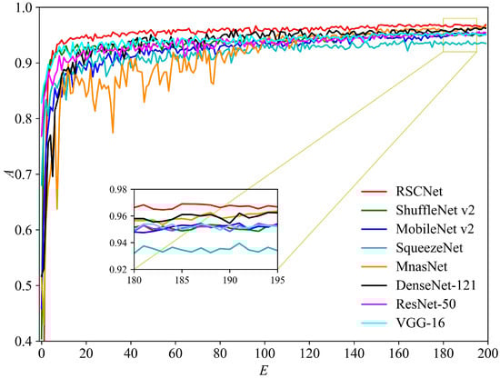 There exist many image classification models based on CNN. In order to demonstrate the model performance advantages of RSCNet, a variety of popular CNN models are selected for comparison experiments. Lightweight networks ShuffleNet v2 [20], MobileNet v2 [19], SqueezeNet [16], and MnasNet [13], and large networks DenseNet-121 [12], ResNet-50 [11], and VGG-16 [22] were selected for the experiments. In addition, models from the references [56,57,58,59] were compared. For a fair comparison, the weights of the above models were all initialized using transfer learning. The above models were trained separately on the AID dataset, and the test accuracy of each epoch was recorded. The training curves of each model are shown in Figure 10.