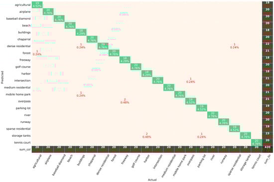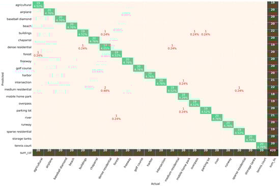 UCMerced_LandUse [26] was a RSSC dataset released by the University of California in 2010. The dataset contained 21 categories of scenarios. The image resolution was 256 × 256 with 100 images per category.