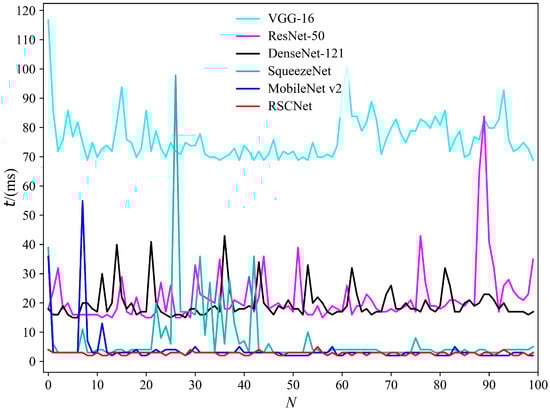For the above model, the model inference is called 100 times consecutively using the program, where the input batch size is 1. Then, the inference time spent for each time is recorded, and the obtained recognition speed is shown in Figure 14. In the figure, t represents the single inference time spent and N is the number of inferences. It can be seen that the average inference time of RSCNet is only 2.75ms, while the lightweight models MobileNet v2 and SqueezeNet are 3.82 ms and 7.43 ms, respectively. And the average inference time of large models VGG-16, ResNet-50, and DenseNet-121 are 76.28 ms, 21.74 ms, and 19.67 ms, respectively. RSCNet’s inference speed is only about 4/11 of SqueezeNet and 1/27 of VGG-16, and the test results show that RSCNet has the shortest average inference time among the compared models. In addition, because RSCNet is a lightweight network and has fewer network branches, there is less fluctuation in the inference process in CPU devices. Some models have very large FLOPs or a lot of branching structures in the network, which can make continuous computation unstable on CPU with tight computational resources.