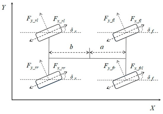 where: —The lateral force provided by the left front wheel; —The lateral force provided by the right front wheel; —The lateral force provided by the left rear wheel; —The lateral force provided by the right rear wheel; —Wheel distance; —The distance from the center of mass to the front axle and the distance from the center of mass to the rear axle; —The steering angle of the front wheel and the steering angle of the rear wheel.