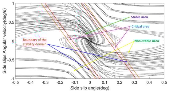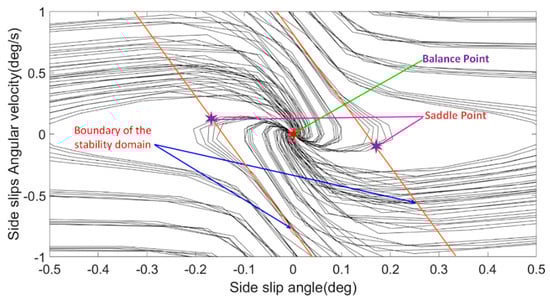 A stability region exists in the phase plane diagram, in which the phase trajectories from any initial point eventually converge to a stable focal point, and then the vehicle can recover to a stable state. To adapt to the complex and changing vehicle driving conditions, this study selected the phase plane of “side slip angle-side slips angular velocity” to study vehicle stability, which is less affected by the vehicle speed. Subsequently, the change of the stability domain boundary is easy to fit under different road surface adhesion conditions and the front-wheel steering angle [,,].