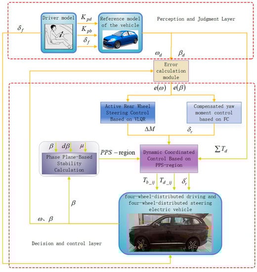 Currently, a single chassis control system has gradually been challenging to meet the driver’s pursuit of car performance. Giving full play to the advantages of various stability control subsystems and coordinating the functions of each system to improve vehicle handling stability and safety further has become one of the critical goals of the future development of automotive active safety technology. Four-wheel-distributed driving and four-wheel-distributed steering electric vehicles use drive motors and steering motors as actuators. This type of vehicle has the characteristics of integrated driving and braking, flexible steering, and easy failure-tolerant control. It has significant advantages in improving vehicle stability and is a suitable carrier for designing and constructing stability-coordinated control systems [,]. Therefore, making full use of this type of electric vehicle’s advantages in driving and steering, a new design scheme of stability coordination control system is proposed and verified by experiments. This has profound significance for promoting industrial development and providing new ideas for technological innovation.