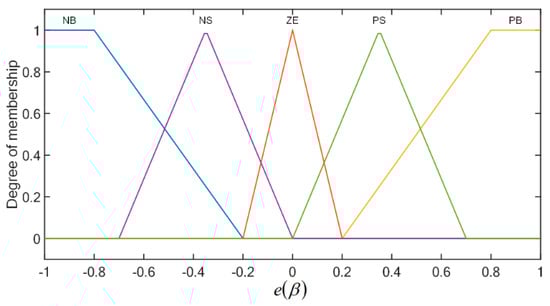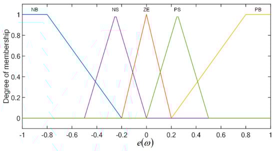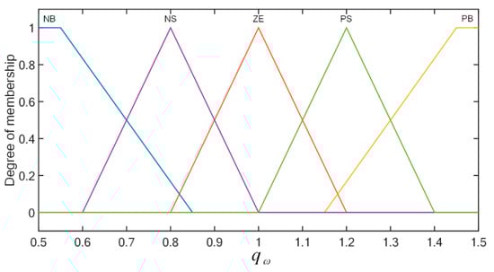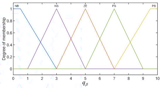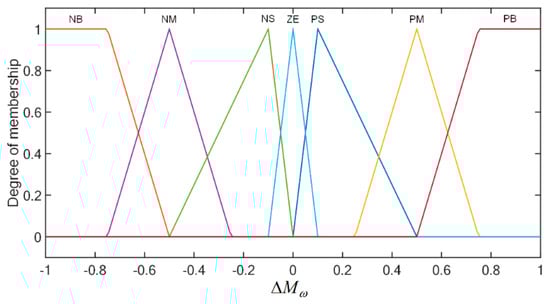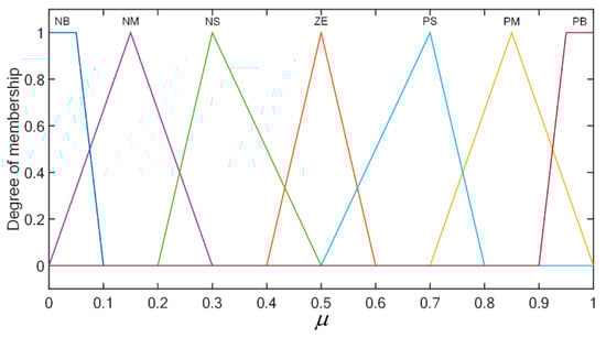 The input and output fuzzy sets are shown in Table 6. The membership function of μ is shown in Figure 7. The membership function of is shown in Figure 8. The membership function of is shown in Figure 9.