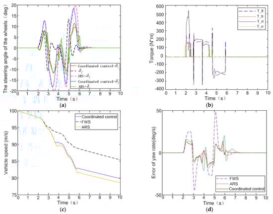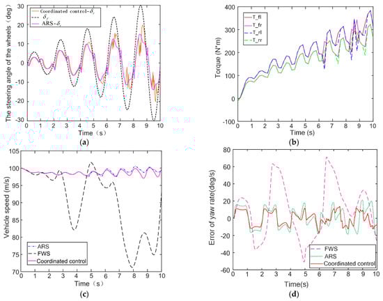 It can be seen from Figure 16a that the vehicle under “ARS” control or coordinated control is able to dynamically calculate the active rear-wheel turning angle based on the vehicle’s driving status. Before 4.5 s, the trajectories of the rear-wheel steering angles of the vehicles under “ARS” control and coordinated control are basically coincident because both vehicles are in the stable region and have the same control strategy. It can be seen from Figure 16b that the vehicle under coordinated control is capable of dynamically adjusting the wheel torque and using the yaw moment to control the vehicle. Figure 16c–f show that: The stability of the vehicle under “FWS” control is poor, with obvious speed drops at 3~4 s and 7~10 s, sharp fluctuations in the yaw rate, large tracking error in the side slip angle, and large displacement in the Y direction. The vehicle stability under coordinated control is satisfactory, the vehicle speed is basically maintained between 98 km/h and 102 km/h, the fluctuation of yaw rate is kept within ±20°/s, the tracking error of the side slip angle is consistently kept within ±5°, and the displacement in the Y direction is minor. The vehicle stability performance under “ARS” control is between the first two.