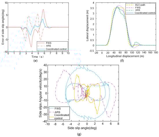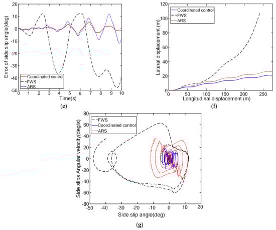Based on the above analysis, it is not difficult to find: Both “ARS” control and coordinated control can effectively reduce the maximum response amplitude of the yaw rate error curve and the maximum response amplitude of the side slip angle error curve. However, coordinated control can further optimize the control effect and better ensure the vehicle’s stability under high-speed and complex working conditions. This conclusion can also be verified here from the phase plane diagram. It can be seen from Figure 16g that, compared with the other two control methods, the phase plane trajectory convergence of the vehicle under coordinated control is the finest.