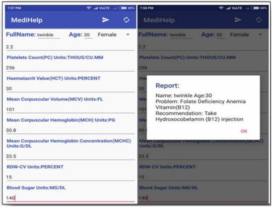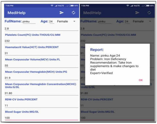 In Figure 8, the third sample is by a female user named Twinkle aged 30. Based on the input values, the S-ANFIS concluded the Folate Deficiency Anemia and the outcome as a recommendation is to Take Hydroxocobelamin (B12) injection.