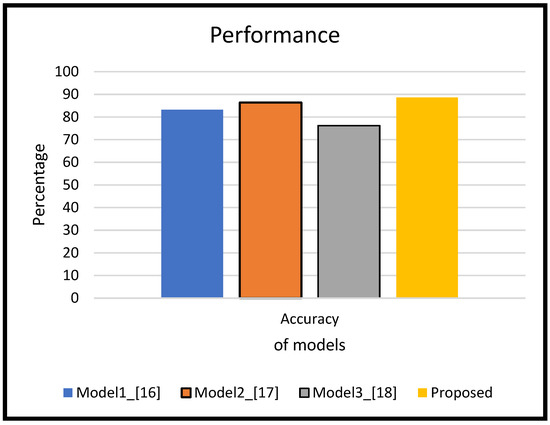 If the same results are compared with the three existing models, the result of the proposed model is performing better. In the existing models [16,17,18], the working of models is based on ANN and ANFIS methodology. The results comparison is shown in Figure 10.