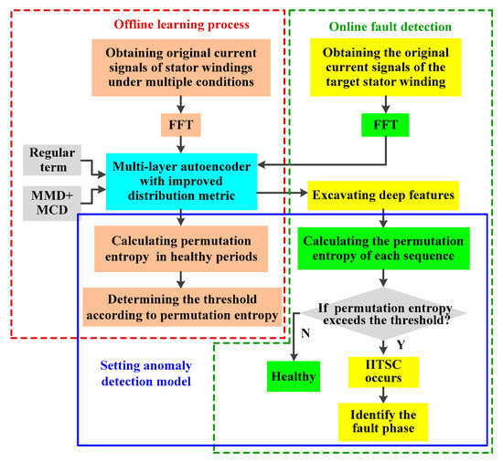 In the offline training process, the common features extracted are used to calculate the permutation entropy of the normal stator winding data under different conditions. Then, the minimum of these permutation entropies is treated as the detection threshold. In the fault detection process, the MDAE is used to extract the depth features, then the corresponding permutation entropy is calculated and compared with the threshold. If the permutation entropy exceeds the threshold, then the IITSC will occur and the fault phase will be identified.