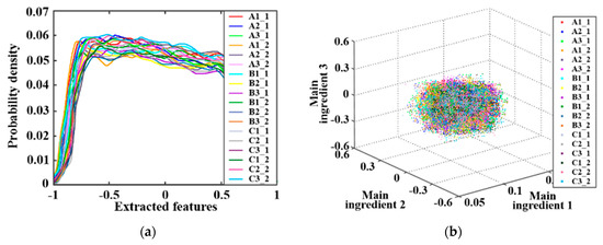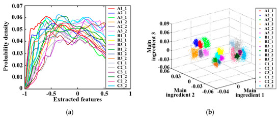 Feature distributions of windings state data extracted by the proposed method: (a) Probability density function; (b) 3D feature distribution.