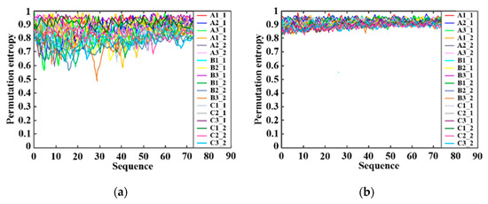 Permutation entropy of the stator windings in a normal state: (a) Extracted by the ordinary AE; (b) Extracted by the proposed MDAE with MMD + MCD.
