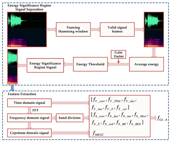 The value of the energy threshold can be changed by adjusting the gain factor α. For a fixed frame signal, the range of energy prominence regions is reduced by a higher energy threshold, and the energy of the signal used for feature extraction is more prominent. By comparing frame energy to the energy threshold, the signal frames with higher energy and the signal frames with lower energy are classified into two groups. The high-energy frame signals constitute the energy prominence regions.