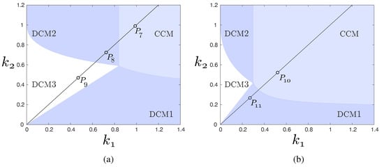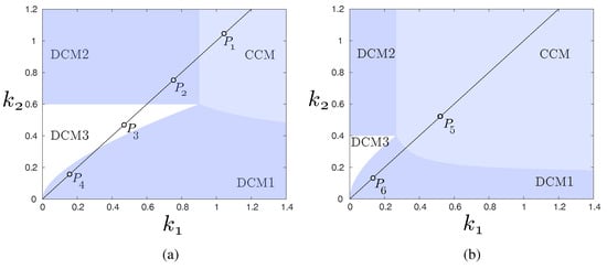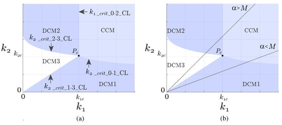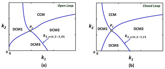 where corresponds to the border between CCM and DCM. In addition, is defined for both the open- and closed-loop conditions and its values are specific to each converter. The conduction modes can be determined from k and as follows: