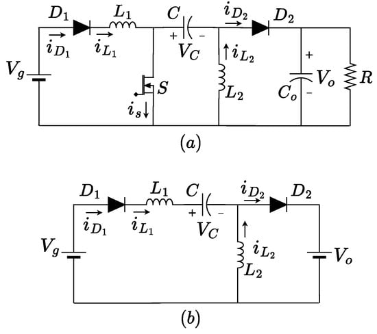 Some general considerations were made in order to simplify the subsequent calculations. In the conduction mode , which is the CCM, and , which is the DCM1, the diode conducts throughout the entire switching period; consequently, the voltage drop in is always 0. The average voltage evaluation in the mesh formed by voltage source , diode , inductor , capacitor C, and inductor , leads to the following conclusion: