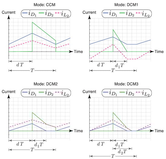 Calculating the number of non-redundant diodes n is important to determine the total number of conduction modes. If , then there are multiple DCMs, in total, conduction modes, 1 of them will be the CCM, and the remaining modes will be the DCMs. Each conduction mode corresponds to certain characteristics of the current waveforms in the diodes. To establish a correlation between waveforms and the name assigned to each mode, a vector can be defined, where the value of is 1 if the diode is conducting at the end of the switching period and 0 if it is in the blocking state at that moment. The value corresponds to CCM, while the remaining cases correspond to DCMs.