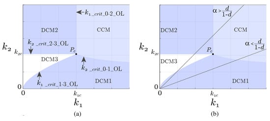 In the k-space, each conduction mode will be a space of n dimensions and the border between modes will be an dimensional space. These borders depend on the control strategy. Thus, there will be certain borders if the converter operates in an open loop at a constant duty cycle and input voltage, and others if it operates in a closed loop at a constant voltage conversion ratio and input voltage. Borders can always be calculated by equaling the voltage conversion ratios corresponding to two adjacent conduction modes. An example of the k-space for is shown in Figure 1, both for open- and closed-loop operation conditions. It can be noted that for , the k-space and the regions in the k-space corresponding to each conduction mode have 2 dimensions while the borders between modes have 1 dimension.