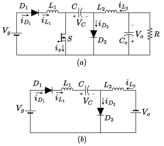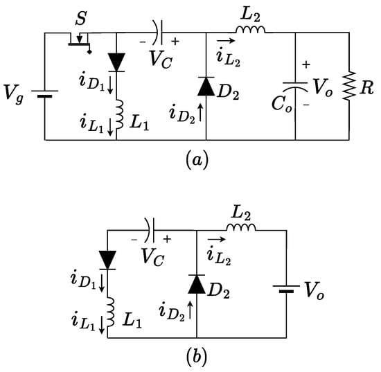(a) Ćuk modified converter with a diode at the input port, (b) equivalent circuit when the transistor is OFF.