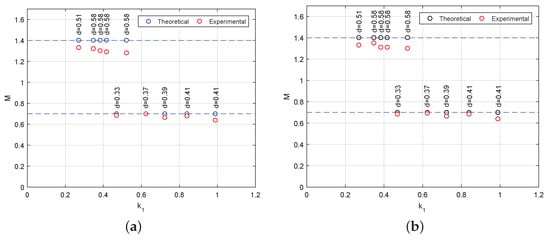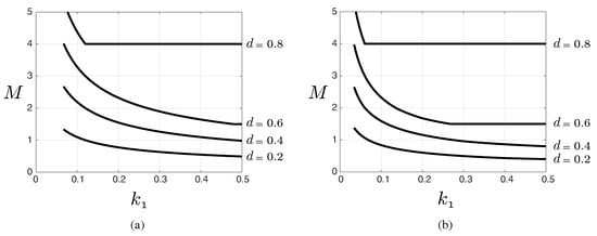 The relationships between M and k were plotted on the plane for each value of the duty cycle d and for a given value of the inductor ratio . It should be noted that is inversely proportional to R, which means that the obtained plots are representations of the variations of the voltage conversion ratios when the normalized output conductance changes. A couple of examples of these plots are shown in Figure 8. As previously mentioned, there are 2 types of possible trajectories, depending on the d value. Thus, the trajectory will be CCM-DCM2-DCM3-DCM1 if: