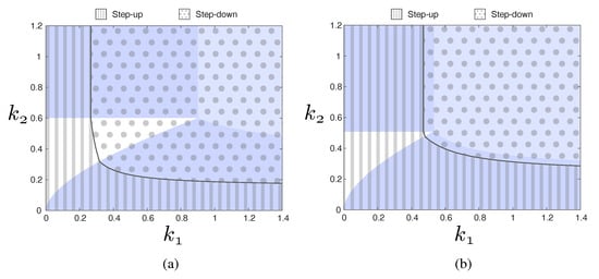 Converters belonging to the buck-boost family can operate in a step-down mode or a step-up mode. When operating in the CCM, these converters always work in a step-down mode if . However, the voltage conversion ratio of these converters increases when they start working in any DCM, as Figure 8 shows. Therefore, they can operate in a step-up mode when if they are working in any of the DCMs at proper values of and . Consequently, the operating regions in a step-down mode and a step-up mode can be delimited in the maps of regions in the planes corresponding to work in an open loop with . The boundary between the step-down mode and step-up mode will be easily obtained by replacing with 1 in (13), (16), and (22). The results of this action are three curves, one for each DCM (i.e., the border between step-down mode and step-up mode in each region). Figure 10 shows two examples, one for and the other for . As is very close to the limit value , the main part of the points in DCM regions belongs to the step-up mode in this case.
