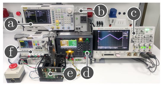 Experimental setup for testing in SEPIC and Ćuk converters: (a) arbitrary waveform generator to program the duty cycles, (b) auxiliary power supply to current probes, (c) oscilloscope, (d) electronic load, (e) reconfigurable prototype, and (f) DC power source.