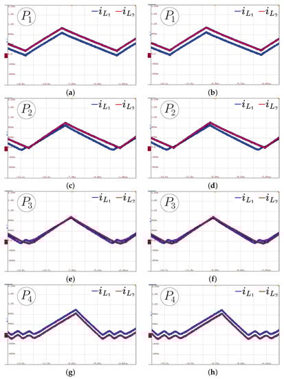 Inductor current waveforms in the open-loop control with a duty cycle of : (a) SEPIC in point , (b) Ćuk in point , (c) SEPIC in point , (d) Ćuk in point , (e) SEPIC in point , (f) Ćuk in point , (g) SEPIC in point , and (h) Ćuk in point , (400 mA/div, DC coupling, and a time base of s).