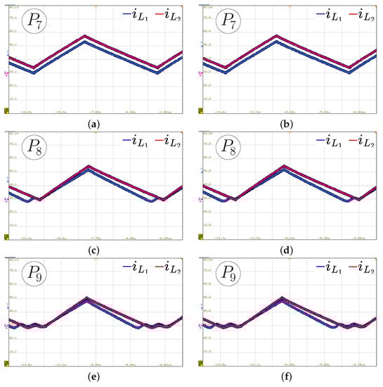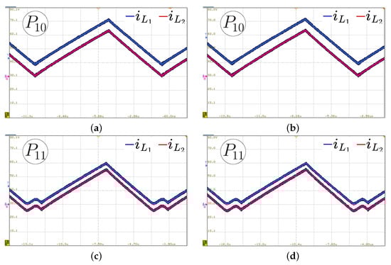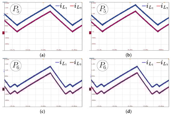 Experimental results in the open-loop operation are shown in Figure 14 and Figure 15, while closed-loop results are depicted in Figure 16 and Figure 17. In each case, the inductor current waveforms obtained for the SEPIC and the Ćuk converter are compared. The waveforms given in Figure 14 for the open loop correspond to , while those of Figure 15 were obtained when . Regarding the closed-loop control, Figure 16 shows waveforms for , whereas Figure 17 shows waveforms for . The comparison of the results obtained shows the same behaviors of the inductor currents for both the SEPIC and Ćuk converters in all operation points. Finally, it should be noted that the experimental waveforms obtained are in good agreement with the theoretical waveforms. Table 4 summarizes the experimental results in a closed loop, where efficiency, current ripple, and voltage conversion ratio are presented for all operation points.